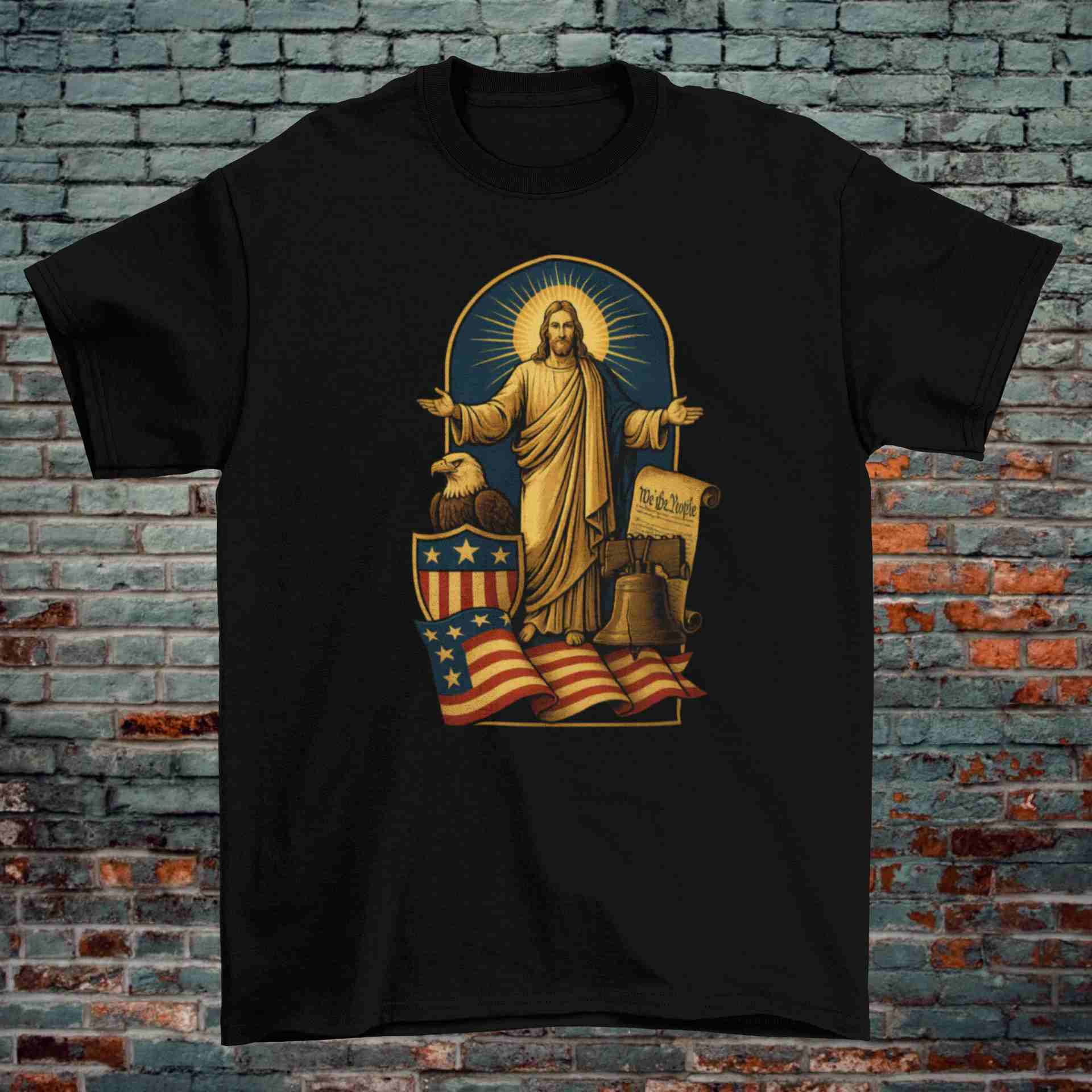 Celebrate faith and freedom with this powerful “Jesus & the Constitution” graphic t-shirt. Featuring Christ at the center, arms open in peace and authority, surrounded by American icons—the bald eagle, the U.S. flag, the Liberty Bell, the Constitution, and the stars and stripes shield—this design unites Christian conviction with American heritage.
